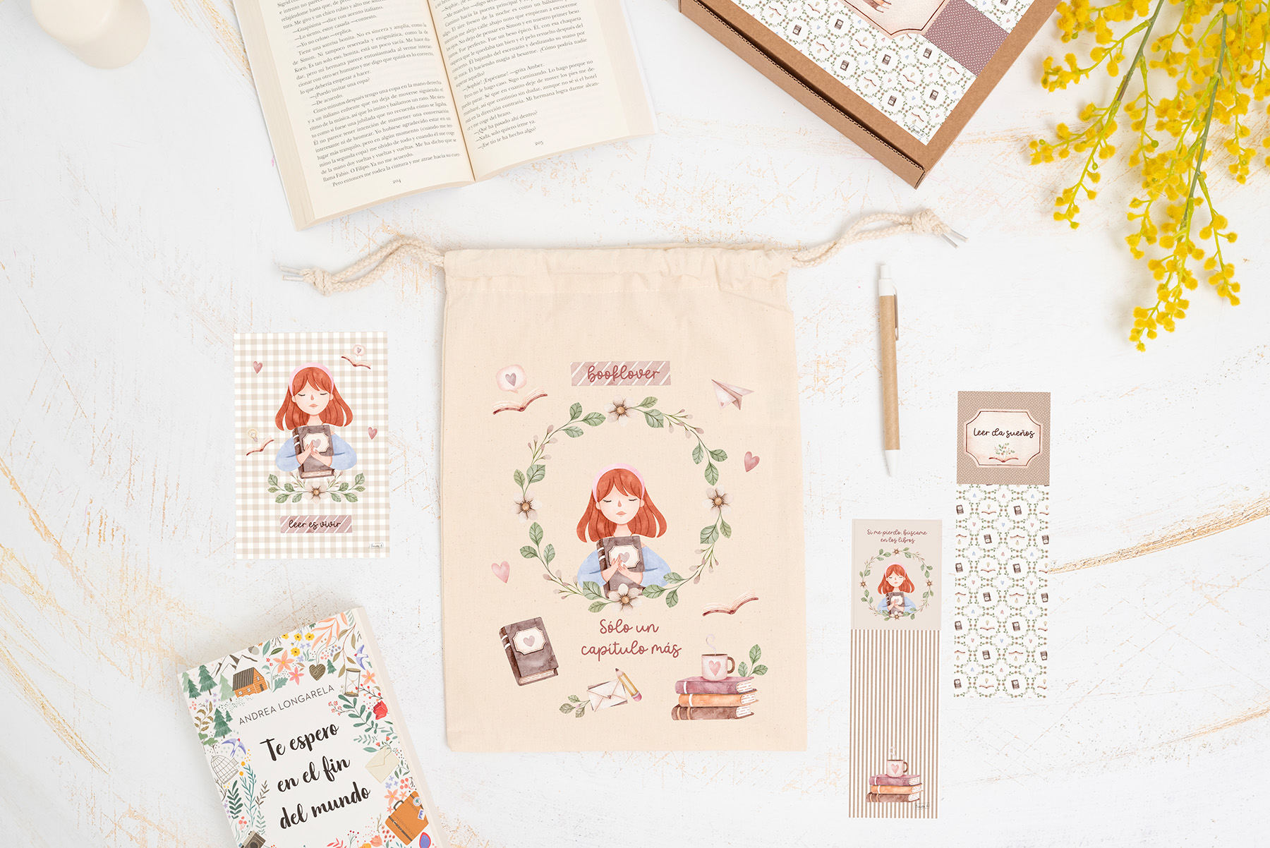 • Pack nº 1: Bolsa guarda libro, postal y dos marca páginas.